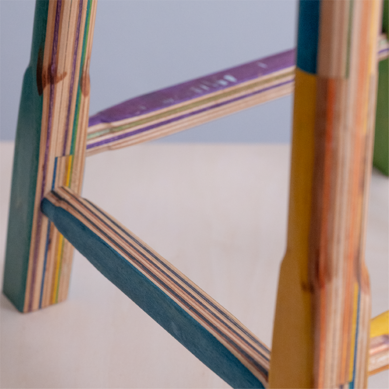 廃棄されるはずだったスケートボードに新たな命を吹き込んだこのスツールは、Imano の主力商品として、環境意識の高いデザインと個性的な美しさを兼ね備えています。